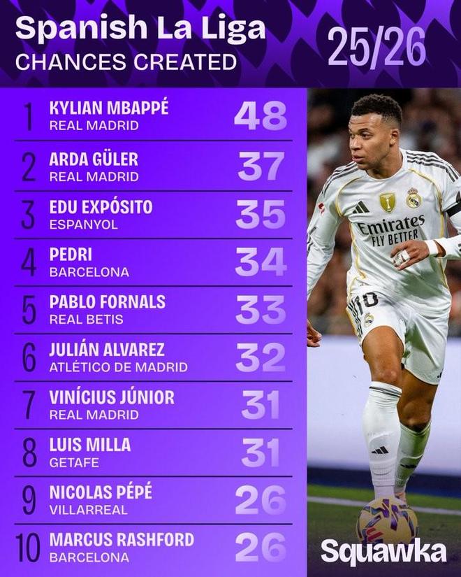 根據(jù)統(tǒng)計(jì),本賽季到目前為止,姆巴佩是西甲當(dāng)中創(chuàng)造機(jī)會最多的球員,居萊爾位居第二,西班牙人中場埃杜位居第三。